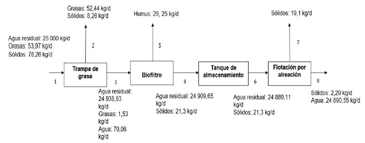 Abstract: This research aims to develop a wastewater treatment process for a sausage industry, which is based on a grease and oil interceptor, an air flotation system and a biofilter or worm filter, so that these discharges comply with the regulations for liquid discharges to the sewage system of the city of Quito, Resolution N002-SA-2014. In the characterization of raw wastewater from the sausage industry, it was identified that the limits for BOD5, COD, suspended solids, oils, and fats are not met, with values of 2314 mg/L; 3046 mg/L; 3131 mg/L and 2159 mg/L, respectively. For the design of the treatment system, the best operating conditions were considered, which are: a residence time of 5,2 min in the grease trap, for a removal efficiency of 97 %, 14 hours of retention in the worm filter for an efficiency of 86 % and 20 minutes in the aeration flotation system with an efficiency of 89 %. The dimensions of the grease trap were 0,3 meters long and 1.4 meters high with a 0.06 kW centrifugal pump; 2,7 meters of total height among the three worm filters; a bed 1,5 meters high; 5,5 meters wide and 6,5 meters long; a storage tank 2,1 meters high and 2,1 meters circular radius with a 0.18 kW pump. There is also a square-shaped cell for the air flotation system, measuring 0,7 meters long; 1,4 meters high and a mechanical agitator with inclined blades with a power of 0,19 kW.
