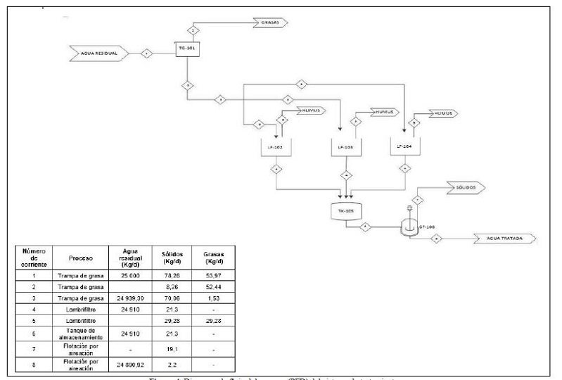 Resumen: Con esta investigación, se pretende desarrollar un proceso de tratamiento de aguas residuales de una industria de embutidos, el cual se basa en un interceptor de grasas y aceites, un sistema de flotación por aire y un biofiltro o lombrifiltro, a fin de que estas descargas cumplan con la normativa para descargas líquidas al alcantarillado de la ciudad de Quito, la Resolución N002-SA-2014. En la caracterización de las aguas residuales crudas de la industria de embutidos se identificó que se incumplen los límites de DBO5, DQO, sólidos suspendidos, aceites y grasas, con valores de 2314 mg/L; 3046 mg/L; 3131 mg/L y 2159 mg/L, respectivamente. Para el diseño del sistema de tratamiento se tomaron en cuenta las mejores condiciones operativas que son: un tiempo de residencia de 5,2 min en la trampa de grasas, para una eficiencia de remoción del 97 %, 14 horas de retención en el lombrifiltro para una eficiencia del 87 % y 20 minutos en el sistema de flotación por aireación con un porcentaje de eficiencia del 89 %. Las dimensiones de la trampa de grasa fueron 0,3 metros de longitud y 1,4 metros de altura con una bomba rotodinámica de 0,06 kW de potencia; 2,7 metros de altura total entre los tres lombrifiltros; un lecho de 1,5 metros de alto; 5,5 metros de ancho y 6,5 metros de longitud; un tanque de almacenamiento de 2,1 metros de altura y 2,1 metros de radio circular con una bomba de 0,18 kW. Se contempla también una celda de forma cuadrada para el sistema de flotación por aire, con medidas de 0,7 metros de largo; 1,4 metros de alto y un agitador mecánico de cuchillas inclinadas con una potencia de 0,19 kW.