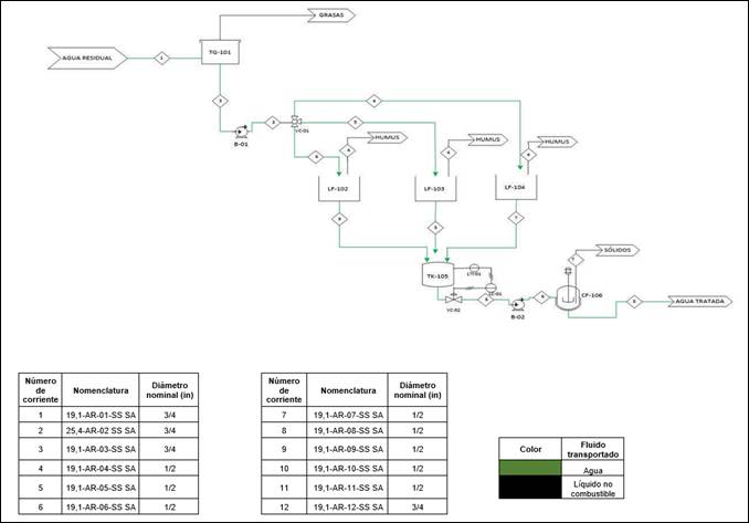 Las operaciones unitarias del diagrama de flujo del proceso (PFD) se connotan con números y letras para su identificación. El diagrama indica secuencialmente las actividades realizadas y los procesos involucrados en el sistema de tratamiento de aguas residuales. Los procesos en el diagrama de flujo del proceso se nombran en función de la nomenclatura de los equipos, tal como se presenta en la Figura 4.