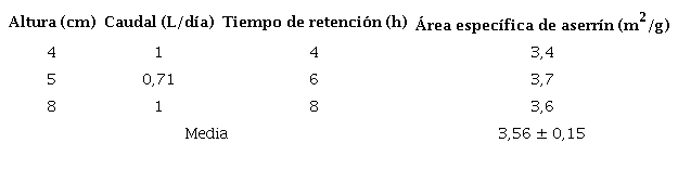 La determinación del área de aserrín, tomó en cuenta parámetros como el caudal, la altura y el tiempo de retención. El detalle de los resultados se presenta en la Tabla 1.