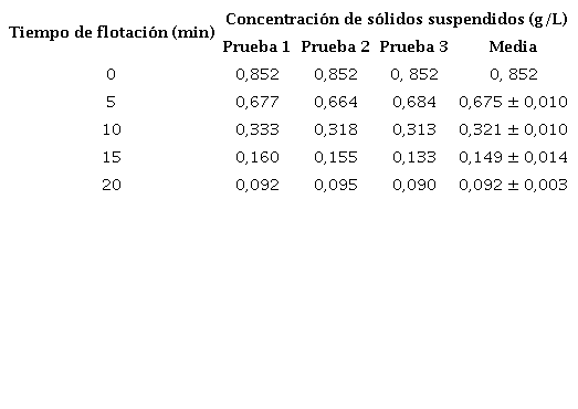 La Tabla 2 contiene la información de la variación de la concentración, expresado en g/L, de los sólidos suspendidos a diferentes tiempos de flotación y una velocidad de agitación de 1400 revoluciones por minuto.