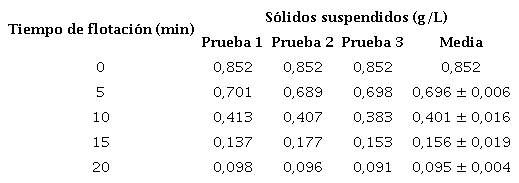 Como se puede evidenciar, a un tiempo de flotación de 20 minutos y un velocidad de 1400 revoluciones por minuto (rpm), la cuantificación de sólidos suspendidos disminuye a un valor de 92 ± 3 g/L (89,2% de remoción), un valor que se encuentra dentro de los límites permitidos por la Resolución N°2-SA-2014.