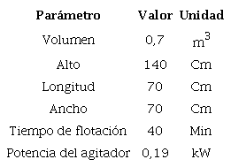 Los resultados de la determinación de las dimensiones de la celda de flotación a escala industrial se detallan en la Tabla 4.