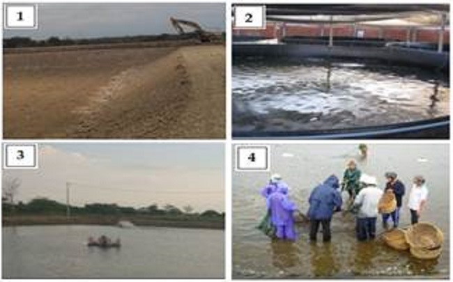 La producción de camarones se inicia con la preparación del terreno y realización de obras civiles para la construcción de piscinas y estabilización de muros. Se requiere un suelo limo-arcilloso de mínima filtración o cubierto por membrana. La preparación de las piscinas para la siembra incluye, además, el uso de fertilizantes y desinfectantes. La larva de camarón recibe un tratamiento de maduración por medio de un proceso de raceways o precriaderos, que consiste en la adaptación en estanques de menor tamaño con control de parámetros como PH, salinidad, temperatura, oxigeno, bacterias, etc. Posteriormente, se realiza el cultivo de la post-larva para la cría y engorde en las piscinas, durante 90 y 120 días, según el tamaño de camarón que se desee. El cultivo de la post-larva exige un recambio de agua y el empleo de sistemas de aireación de 24 horas, en función de la densidad de la siembra, que garantice niveles adecuados de oxígeno para la supervivencia del camarón. Finalmente, se realiza la cosecha de forma manual o con cosechadoras, que deberá, recoger los camarones sin causarles daño ya sea por manipulación o estrés, véase Fig. 1 (Aguilar & Parrales, 2015); (Ochoa, 2016).