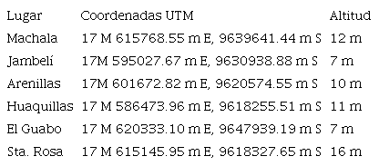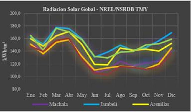 Se obtiene información de la radiación solar, temperatura, velocidad del viento de 5 cantones, donde se desarrolla la actividad acuícola en la provincia de El Oro. La evaluación del potencial solar de los sitios estudiados se obtiene a partir de la base meteorológica NREL/NSRDB TMY y de los modelos de radiación del atlas solar del Ecuador, y las estaciones meteorológicas cercanas a los sitios según el anuario del INAMHI, Tabla 2.