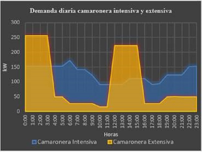 La Fig. 5 muestra la curva de demanda eléctrica diaria para los casos de cultivo intensivo y extensivo, en el caso de las camaroneras intensivas la curva de consumo es mucho más plana en comparación con la curva del sistema extensivo, debido a que los sistemas de aireación que representan su carga más alta funcionan de forma prácticamente continúa durante toda la producción, mientras que el sistema de bombeo en las camaroneras extensivas opera únicamente cuando existe marea alta o si se requiere recirculación del agua.