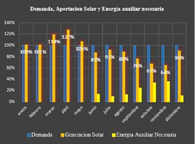 En la Fig. 5 se compara mensualmente la demanda eléctrica, aportación solar y energía auxiliar necesaria para satisfacer el consumo eléctrico de una finca camaronera de tipo intensivo, considerando las características técnicas de la instalación solar aislada propuesta (Tabla 4). En los meses de junio a diciembre se requerirá energía auxiliar. El mes más crítico es noviembre, ya que existe un déficit de generación del 36%, que deberá ser cubierto por los equipos diésel. Durante los meses de marzo, abril y mayo, se prevé que la generación solar sea superior a la demanda. En abril se estima una generación solar mayor en un 27% a la demanda, un exceso que se empleará en otros usos.