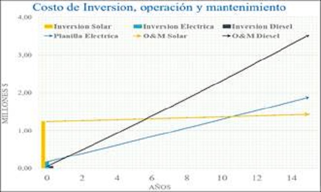 El cálculo del valor actual neto (VAN) resulta de la comparación del flujo costo anual de la tecnología diésel actual versus los costos de la tecnología solar, que implica una inversión inicial elevada, pero con gastos de operación mínimos en comparación con el diésel.