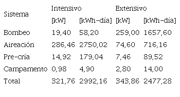 La Tabla 4 muestra los valores de demanda eléctrica requerida para los diferentes procesos de la producción de camarones en función del tipo de producción ya sea esta intensiva o extensiva. El consumo eléctrico del sistema de aireación representa la carga más importante de la instalación en cultivos intensivos, en tanto que, en cultivos extensivos lo son los sistemas de bombeo, ya que en camaroneras extensivas será necesario bombear mucha más agua para llenar las piscinas, mientras que en los sistemas intensivos debido a la densidad de siembra es indispensable mantener los niveles de oxígeno adecuados mediante aireadores.
