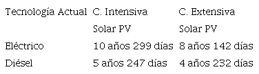 Los resultados económicos muestran que los proyectos de energía solar fotovoltaica para el sector acuícola intensivo y extensivo son rentables. El VAN evaluado de una instalación fotovoltaica resulta positivo. Asimismo, el periodo de recuperación de la inversión es aproximadamente de 5 años. Por otra parte, los resultados muestran que el sistema tipo extensivo presenta un periodo de recuperación de la inversión más corto, en comparación con el sistema tipo extensivo, debido a que la capacidad solar a instalar y, por tanto, la inversión esperada es menor.