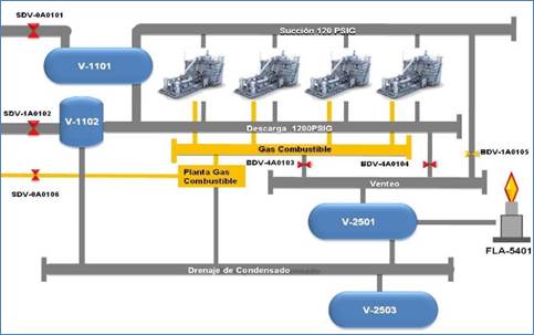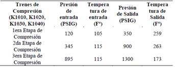 El proceso de compresión en esta planta se lleva a cabo a través de tres (3) etapas. La primera etapa comprime el gas de 120 a 246 psig, la segunda etapa aumenta la presión hasta 553 psig y la última etapa comprime el gas hasta 1200 psig requeridos. Antes de este proceso, es necesario que la corriente de gas se deslice por un depurador general de succión, donde se separan los líquidos de arrastre del gas.