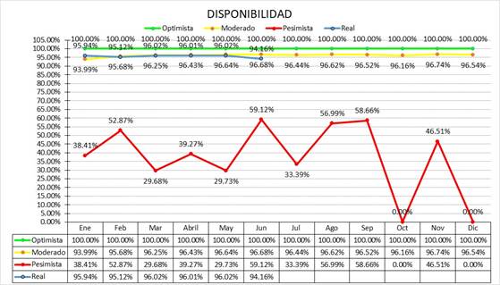 En la Figura 3 se observa qué, en un escenario optimista, la planta de compresión tendría una disponibilidad de 100% en los doce (12) meses proyectados, mientras que, en un escenario moderado, la disponibilidad variaría en un promedio de 96,22% y en un escenario pesimista, la disponibilidad tendría un promedio de 37,05%.
