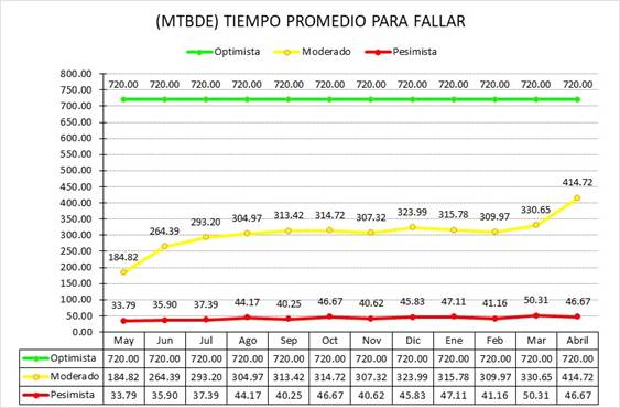 En el escenario optimista, se muestra un promedio anual de 720 horas sin fallar, que se resumen en que no se presenten fallas en cada mes. En el escenario moderado, se muestra un promedio anual de 306,50 horas y para el escenario pesimista, se muestra un promedio de 42,49 horas.