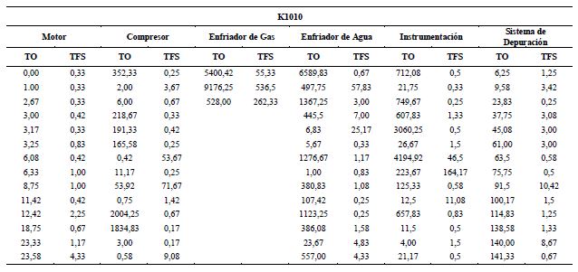 Para conocer el comportamiento de los equipos pertenecientes a esta planta, se seleccionó una data histórica de fallas de 2 años, debido a que es el mínimo requerido por la metodología desarrollada. La data utilizada abarca el periodo comprendido desde el 25/04/2019 hasta el 25/04/2021, equivalente a 17544 horas totales. Esta información fue suministrada por el departamento de Ingeniería de Confiabilidad de PDVSA Compresión Gas, a través del registro de reportes diarios manejados por el personal de la planta, donde se muestran la fecha-hora de paros y arranque, tiempos fuera de servicio (TFS), tiempo entre fallas (TEF), tiempo de operación (TO), descripción de la falla y el equipo o sistema de la planta que ha sido afectado. Posteriormente, se procedió a clasificar por equipos y sistemas, las 745 fallas registradas en ese período de tiempo. Esto con el fin de determinar las tasas de fallas y de reparaciones de los componentes o equipos que conforman el sistema bajo estudio, y así conocer los tiempos promedios para fallar (TPPF) y los tiempos promedios fuera de servicio (TPFS) de cada uno de ellos. En la Tabla 2, se observa las fallas por equipos asociadas a la unidad K1010.