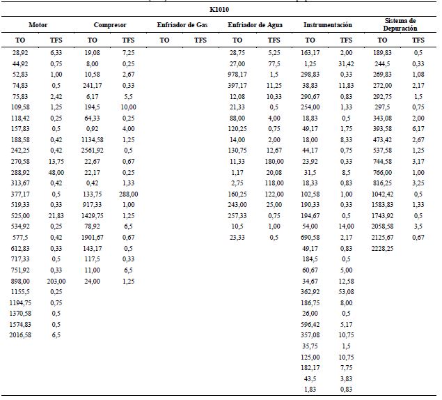 De esta manera, se conoció la tasa de fallas y reparaciones de los equipos y sistemas pertenecientes a la planta compresora Jusepín 12. El TPFS fue el suministrado por los datos históricos recolectados. En tanto para el tiempo promedio para reparar (TPPR) o TO de cada equipo, fue calculado mediante la Ecuación 1.