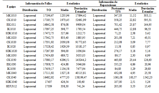 Al realizarse los cálculos de TO y TFS por equipos, se procedió a identificar el tipo de distribución estadística que más se ajusta a los datos de cada equipo o sistema. Este procedimiento se realizó mediante el software Crystal Ball, donde se obtuvieron las distribuciones de probabilidades media y desviación estándar para los 18 equipos que poseían más de 15 datos, tanto en los TO como en sus TFS. En la Tabla