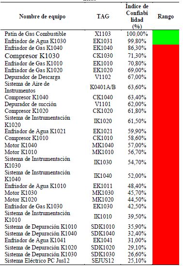 En la tabla anterior, se observa que varios equipos poseen muy baja confiabilidad, esto debido a la presencia constante de fallas, haciendo más énfasis en todos los sistemas de depuración de las unidades motocompresoras,