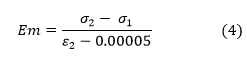 Mediante la aplicación de las ecuaciones presentadas se construyen las curvas esfuerzos vs deformaciones unitarias de cada espécimen, de las cuales se obtienen el módulo de elasticidad aplicando, el método de la cuerda tangente, que se describen en las normas ASTM C469 (2009) y MNX-C-464-ONNCCE (2010). A continuación, se indica la Ecuación 4 utilizada para su cálculo.