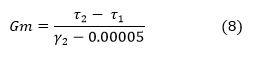 Mediante la aplicación de las ecuaciones indicadas, se construyen las curvas esfuerzos cortantes vs deformaciones angulares de cada espécimen, de las cuales se obtiene el módulo de rigidez a corte siguiendo la misma metodología utilizada para la obtención del módulo de elasticidad, que se describe en las normas ASTM C469 (2009) y MNX-C-464-ONNCCE (2010). A continuación, se indica la Ecuación 8 utilizada para su cálculo.