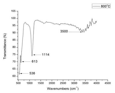 Characteristic peaks at 536 and 613 cm-1 are observed in the FT-IR spectra in Figure 1 corresponding to the oxide prepared from synthetic water (standard sample) and calcined at 800ºC. These peaks indicate the presence of Cr2O3 crystals which give transmissions below 1000 cm-1 and are indicative of stretching of the O-Cr-O bond.