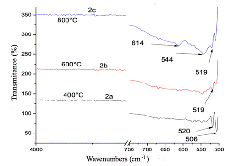 The sample calcined at 800ºC shows a higher transmission percentage and peaks, indicating the stretches of the M-O (Cr-O) bond at 519, 544, and 614 cm-1, confirming the formation of Cr-O bonds in the chromium oxide (Gibot, 2020; Zhang et al., 2014).