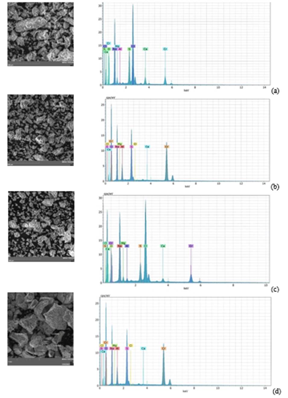 Figure 3 shows the sample synthesized using synthetic water at pH 10, which was then calcined between 400 and 800 °C. The image shows that the sample contains particles with sizes ranging from 0.303 to 0.521 mm. The particles have irregular shapes and large sizes. EDS spectra show the presence of chromium, oxygen, and other elements such as calcium, chlorine, sulfur, and aluminum.