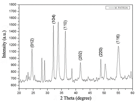 Figure 4 shows the X-ray diffraction (XRD) pattern of the Cr2O3 dye obtained from synthetic water. The dye was calcined at 800°C. The presence of impurities is responsible for the observed non-indexed peaks, which do not correspond to the crystal structure of Cr2O3. The non-indexed peaks observed, which do not correspond to the crystal structure of Cr2O3, are attributed to the presence of impurities. During Cr(OH)3 formation, these impurities co-precipitate in the solid phase and on calcination also produce oxides reflected in the diffraction pattern. Comparing the XRDs of the standard with those obtained from the effluent, the presence of Miller indexes (104) and (202) are observed in both diffraction patterns, confirming the presence of Cr2O3, in addition to other oxides.