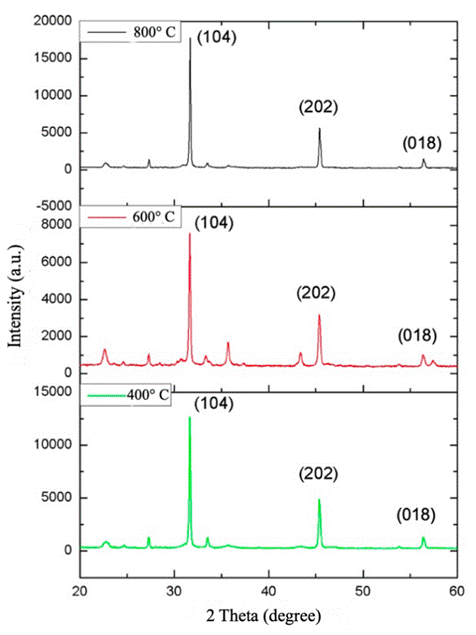 X-ray diffraction (XRD) patterns of Cr2O3 dyes calcined at different temperatures are shown in Figure 5. The indexed peaks correspond to the crystal structure planes of chromium oxide with lattice parameters a=4.953 Å, b=4.953 Å, c=13.588 Å and angles α=90º, β=90º, γ=120º. These parameters are indicative of a compact hexagonal crystal structure with a cell volume of 288.69 pm3 (Cao & Zuo, 2017). As confirmed in Table 1 of the EDX spectra, the non-indexed peaks observed, which are not consistent with the crystal structure of Cr2O3, are due to the presence of impurities. In addition to Cr3+, other cations have been identified which form oxides and can distort the diffraction pattern of the pure dye. The morphological properties of the dyes, analyzed by Cu-Kα radiation (wavelength 1.5406 Å) in the 2θ range (10-80º), show clearly distinguishable peaks of higher intensity at angles 32.60, 46.30 and 57.80, corresponding to Miller indices (104), (202) and (018), which support the crystalline structure of Cr2O3 (Wang et al., 2018). Using these three peaks as a reference, an average crystal size of 78 nm is estimated using the Debye-Scherrer equation (Afzal et al., 2016; Gibot, 2020; Wang et al., 2019). In addition, the intensities of the indexed peak (104) at temperatures of 400, 600 and 800ºC, are 12249.478, 7429.045 and 18415.296 respectively. This confirms more Cr2O3 at 800ºC, corresponding to the highest intensity obtained.