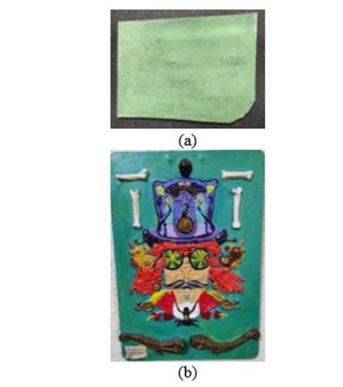 The staining test evaluated the effect of the dye and was carried out on a fragment of glazed glass that had been melted at 900°C. Figure 1(a) shows a green tint, but further experiments are needed to improve the distribution of the tint across the glass surface. Furthermore, other tests should also be carried out with different percentages of Cr2O3 added to the glass during the melting process. According to the literature, it is indicated that the chromium oxide, as a refractory pigment, should be in the range of 1 - 3 % by mass in order to obtain an optimum green color. Similarly, the dye dissolved in water was used in staining tests on canvas and porcelain-based reliefs. Figure 6 shows(b) an optinal green staining.