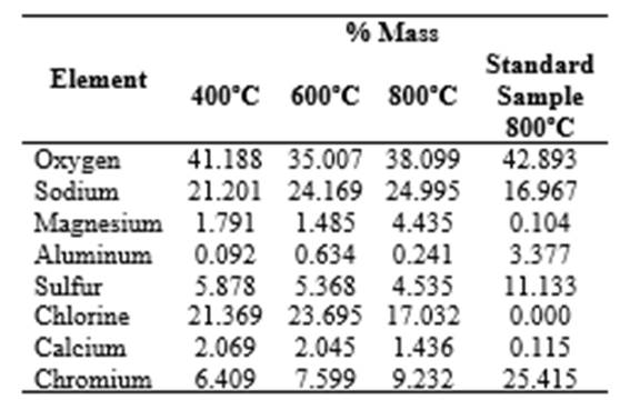 In the EDS spectra in Figure 3, in addition to chromium and oxygen, distinct peaks can be seen. These peaks indicate the presence of elements such as calcium, chlorine, sulfur, aluminum, magnesium, and sodium. It is assumed that these elements were present as co-precipitated ions in the synthesis process. They probably originated from the products used in the tanning process and were still in solution in the effluent. All of the samples show a distinct peak at 5.8 keV, which corresponds to the presence of chromium oxide (Abdullah et al., 2014; Kadowaki et al., 2018). However, the EDS spectrum of the sample treated at 800ºC shows 9.232% by mass. This is higher than the 6.409% and 7.599% of the samples treated at 400ºC and 600ºC, respectively. Furthermore, faint peaks corresponding to other oxides (CaO, Al2O3, MgO, Na2O) are present in the sample, as shown in Figure 3 (Zhao et al., 2018b).