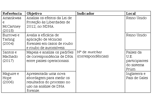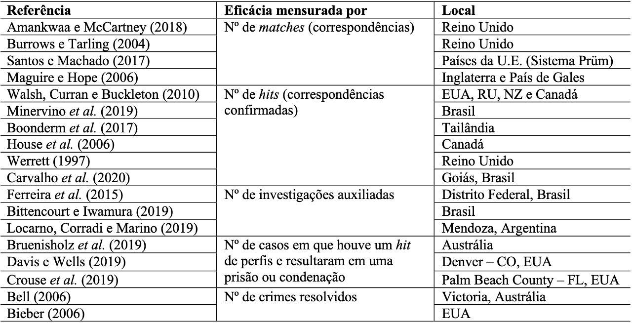 Os artigos oriundos das pesquisas encontradas com os termos combinados “performance” AND “DNA database” foram filtrados de modo que somente aqueles que abordavam aspectos sobre eficácia foram analisados, descartando aqueles que explicitamente tratavam de outras medidas de desempenho que não a eficácia, como a eficiência e a produtividade, dentre outras medidas de desempenho.