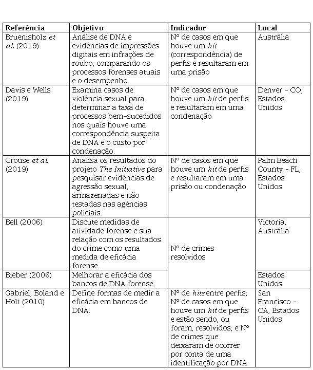 A partir da presente revisão sistemática, foi possível identificar que diversos indicadores têm sido usados para medir a eficácia dos bancos de perfis genéticos. No ambiente micro, relativo aos laboratórios forenses, os indicadores estão relacionados às saídas do processo de confronto genético, ou seja, a quantidade de matches, hits ou investigações auxiliadas. Já em um ambiente mais amplo, levando em conta os subsistemas policial e judicial, os indicadores estavam relacionados a quantidade de casos resolvidos, indivíduos presos ou condenados.