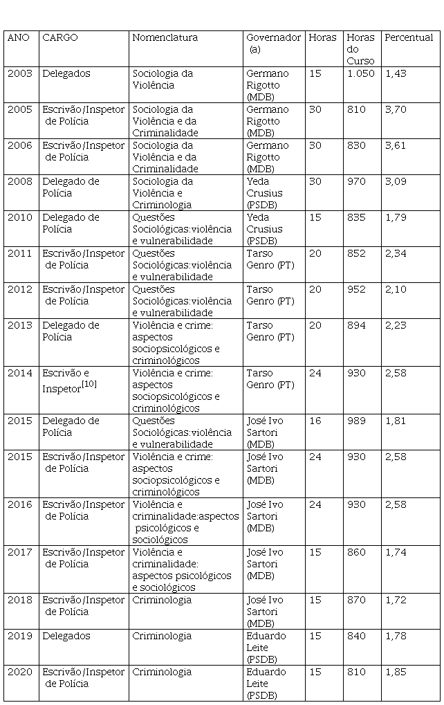 A primeira redução substancial da carga horária da disciplina ligada às Ciências Sociais nos cursos de Escrivão/Inspetor de Polícia Civil foi durante o curso realizado na gestão “tucana” de Yeda Crusius, em 2011. Porém, a primeira turma com a unificação das disciplinas de sociologia e psicologia foi na gestão “petista” de Tarso Genro, em 2013, sendo que, dali até os dias atuais, a disciplina foi unificada com a disciplina da área de psicologia até que, na gestão “emedebista” de José Ivo Sartori (2015-2018), foi unificada em uma disciplina denominada de Criminologia (disciplina esta que uniu sociologia, criminologia e psicologia, as quais possuem conceitos diversos umas das outras). Essa última organização foi mantida pela gestão “tucana” (2019-2022) de Eduardo Leite, a qual foi responsável pelo curso com menor quantidade de carga horária dos últimos vinte anos (810 horas), igualando a gestão emedebista de Germano Rigotto (2003-2007). Frise-se que, em 2003, a disciplina ligada às Ciências Sociais tinha 30 horas em um curso com a carga horária geral de 810 horas, sendo que, neste último curso de 2020, tinha 15 horas para o curso em uma disciplina que uniu sociologia, criminologia e psicologia em um curso com a mesma carga horária geral acima mencionada (810).