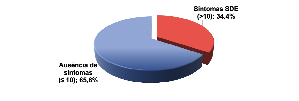 Já a disfunção diurna do sono (SDE), caracterizada pela sonolência durante o dia, foi identificada em 45,6% (n = 57) dos participantes. Nesse grupo que apresentou algum tipo de disfunção diurna, foi identificada a relação desta com presença de fadiga e saúde psicológica razoável, confirmando a associação significativa entre disfunção diurna do sono e saúde psicológica. Para os profissionais com ausência de disfunção diurna/dificuldade leve, a associação ocorreu com a percepção de saúde psicológica boa e ótima. A SDE também é descrita por uma inversão do ciclo circadiano, quando, em decorrência da má qualidade do sono noturno, o indivíduo passa a apresentar desempenho afetado nas atividades cotidianas laborais e estudantis (OLIVEIRA et al., 2020). Estudos indicam que essa desregulação orgânica na dualidade cortisol/melatonina também pode ocasionar, por exemplo, uma maior predisposição ao surgimento de patologias cardiovasculares (DRAGER et al., 2018).