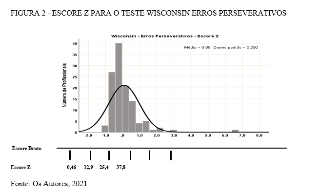 No Subteste de erros perseverativos, o qual avalia capacidade para recordar respostas anteriores, manter a atenção e inibir respostas (BARDENHAGEN; BOWDEN, 1998), a média de pontos foi de 14,6 (DP ± 11,4). Quando as pontuações dos erros perseverativos foram comparadas aos escores da população normal [12,92 ± 12,46], através do Escore Z, os resultados para os profissionais dessa amostra apontaram média de 0,08 (DP ± 0,90).