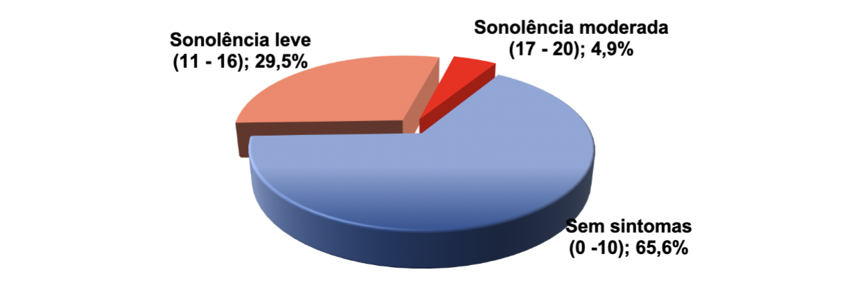 Para os dados da Escala de Sonolência EPWORTH, a pontuação média obtida foi de 9,1 (DP = 3,9). O número de PRFs com SDE foi observada em 34,4% (n = 42) dos profissionais, sendo que 29,5% (n = 36) possuem sonolência leve, e 4,9% (n = 6) apresentaram pontuações relacionadas à sonolência moderada.