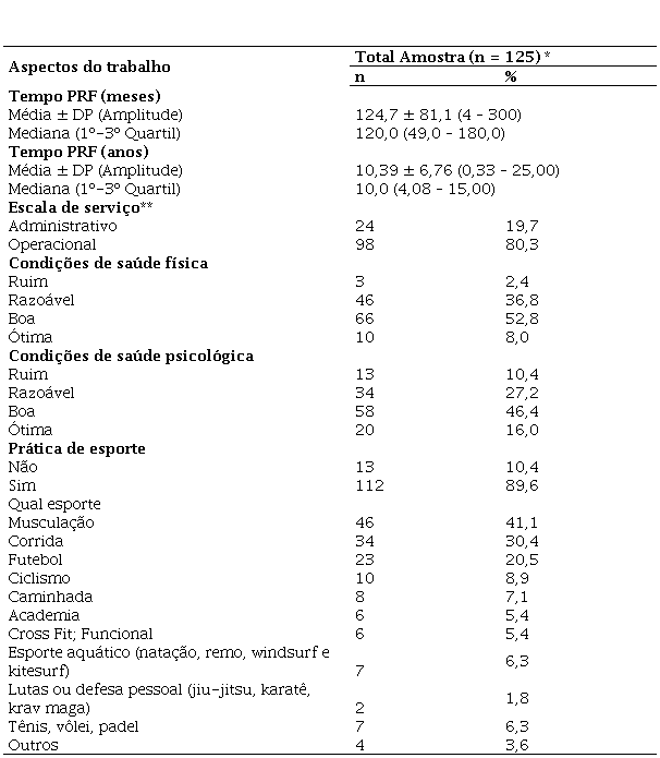 O tempo de trabalho na PRF em média é de 120 meses. A escala de serviço predominante entre os participantes do estudo é operacional – 80,3% (n = 98). Na caracterização de itens que consideram de maior relevância no exercício de suas atividades, os participantes citam a atenção – 100%; capacidade de tomar decisões – 99,2% (n = 124); conhecimento técnico – 94,4% (n = 118); concentração – 92,8% (n = 116). A estratégia (plano, método e habilidade usados para alcançar um objetivo ou resultado específico), foi citada por 72,8% (n = 91) como fundamental. No item percepção das condições de saúde, verificou-se que para o aspecto físico, 52,8% (n = 66) relataram boas condições, seguido daqueles que se caracterizaram como portando razoáveis condições de saúde – 36,8% (n = 46). Em relação aos aspectos psicológicos, foi identificada saúde psíquica boa e razoável, com proporções de 46,4% (n = 58) e 27,2% (n =34), respectivamente (ver Tabela 2).