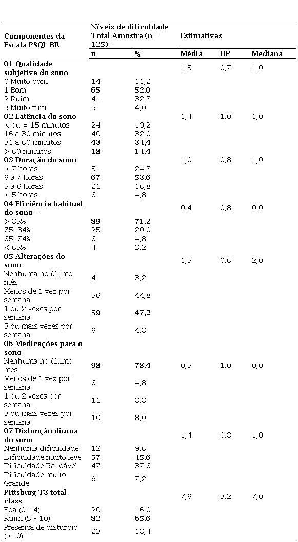 65,6% (n = 82) apresentando escores indicando qualidade do sono ruim;