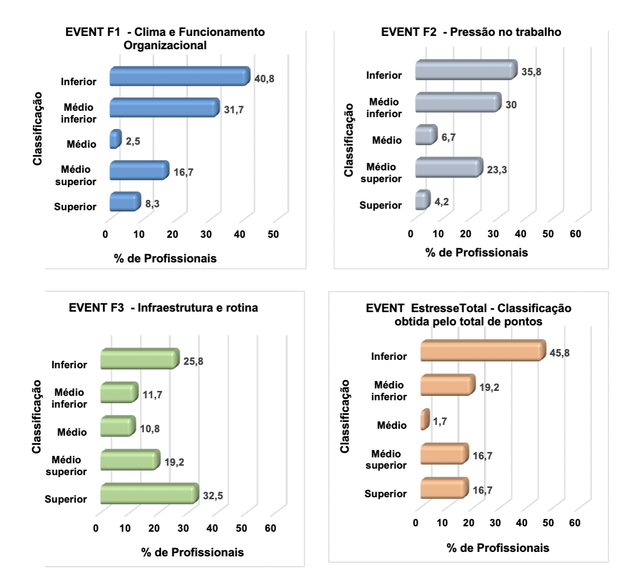 Fator F3 (Infraestrutura e rotina): a média foi de 6,2 (DP = 3,6). A maior frequência foi para classificação Superior, 32,5% (n = 39), indicando ser um fator significativo de estresse. Para esse fator, destinam-se questões como dobrar jornada de trabalho, problemas de saúde e acidentes de trabalho.