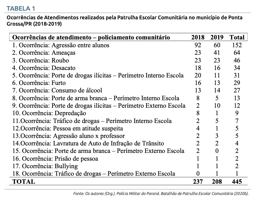 Abstract: Based on community policing, the Community School Patrol (PEC) is a program developed in the State of Paraná that operates in an integrated manner with the school environment and in conjunction with communities in several municipalities in the state, including the municipality of Ponta Grossa. Considering the characteristics of this program, this article aims to analyze its performance in the municipality of Ponta Grossa, in the light of the Bioecological Theory. To this end, a literature review was carried out on the said theory and a brief characterization of the PEC and, in the sequence, documentary data from Ponta Grossa PEC-PG from 2018 and 2019 were analyzed. The results indicate a set of educational actions developed in articulation with schools and interactively with the local community, which confirms the police action at the level of the students 'mesosystem and opens a space for interventions that consider the students' human development demands, surpassing the traditional standard of police action.