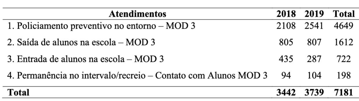 - Em 2019: uma ocorrência de porte de arma de fogo – Perímetro Externo Escola; uma dinâmica – Percepção da Segurança – Alunos – MOD 1; uma revista pessoal sob fundada suspeita na Escola – MOD 3; 159 ocorrências de outras naturezas e 7 assistências.