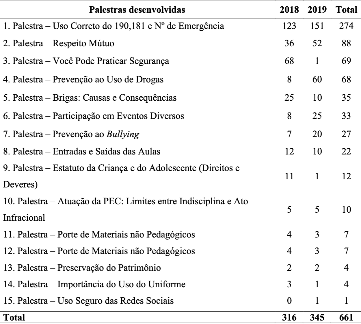 A seguir, na Tabela 3 encontram-se dados referentes às palestras proferidas pelo BPEC, as quais compõem o conjunto de atividades educativas na relação com a comunidade escolar.