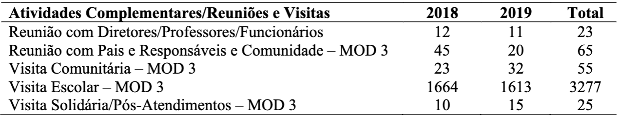 Na Tabela 4, destacam-se as atividades Complementares/Reuniões e Visitas na Cidade de Ponta Grossa/PR realizadas pela Patrulha Escolar Comunitária em 2018 e 2019.
