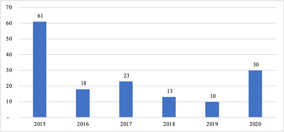 Os dados mostram que em 2015 o número de ocorrências envolvendo crime de desmatamento atendidos pelo BPAmb somaram em torno de 60, com redução nos anos seguintes até atingir 10 casos em 2019, porém, passou a subir em 2020, chegando a 30 ocorrências (Gráfico 7).