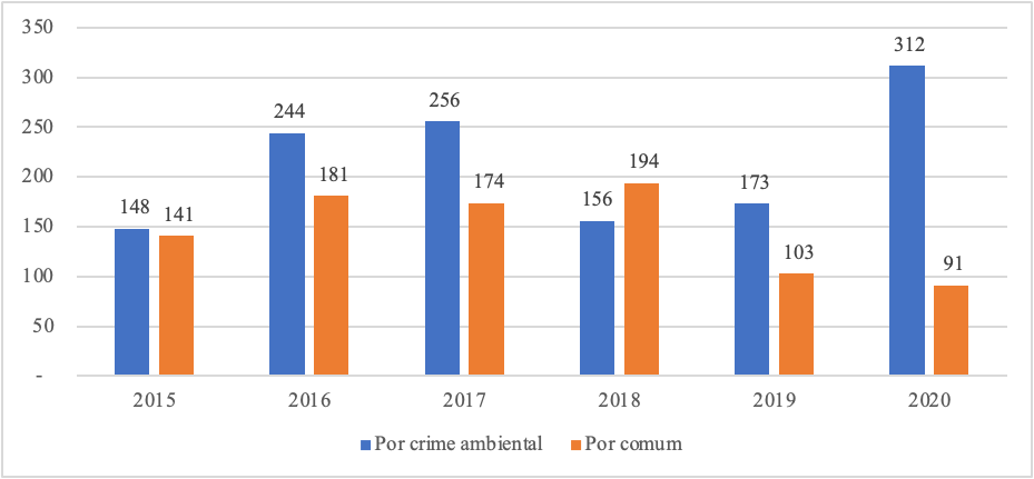 O número de pessoas presas ou detidas por crime ambiental pelo BPAmb aumentou de 2015 a 2017, porém com redução significativa em 2018. Em seguida, mostrou pequeno aumento no ano de 2019 e atingiu o maior número do período em 2020, quando ultrapassou os 300 casos. Já quando observado o número de pessoas presas por crimes comuns, ocorreu aumento consecutivo de 2015 a 2018, porém com redução em 2019 e 2020, mantendo-se abaixo de 100 ocorrências (Gráfico 8).