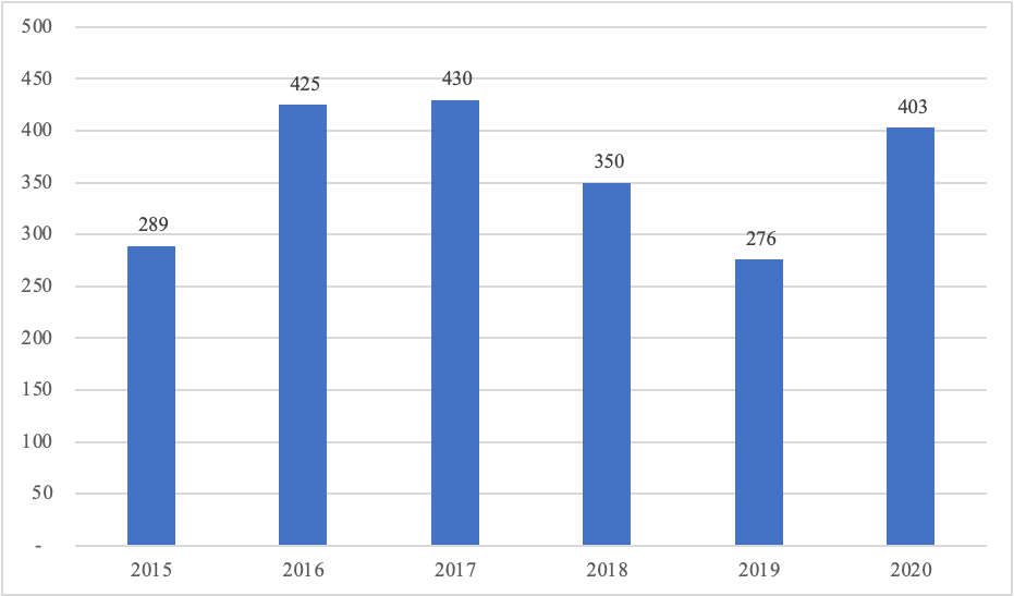 Quando avaliado o número total de pessoas pressas ou detidas pelo BPAmb no período (Gráfico 9), observa-se que houve aumento de 2015 a 2017, ultrapassando 400 ocorrências nos anos de 2016 e 2017. Em seguida, verifica-se redução no número de pessoas presas ou detidas nos anos de 2018 e 2019; por fim, volta a ultrapassar 400 ocorrências no ano de 2020.