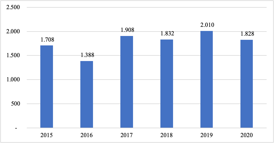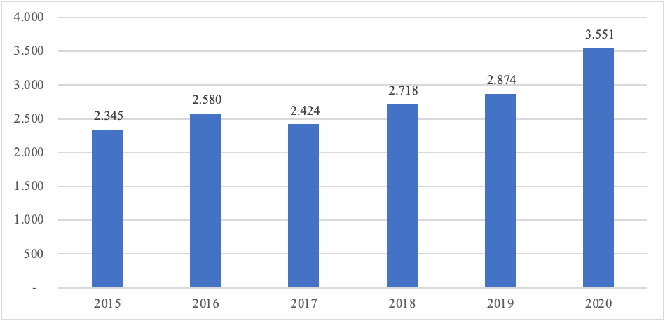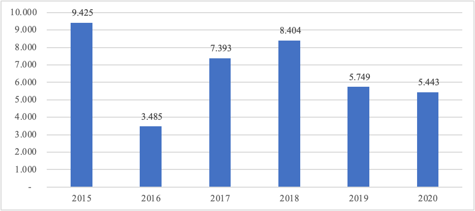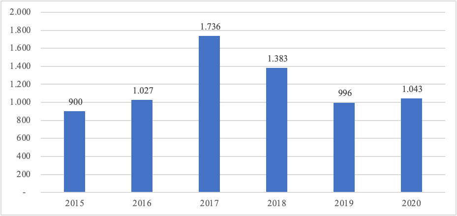 Os autos de infração expedidos pelo BPAmb aumentaram entre 2015 e 2017, saindo de 900 incidências para 1.736. Porém, há redução nos anos de 2018 e 2019, comparativamente ao ano de 2017, passando novamente a aumentar de forma sensível no ano de 2020 (Gráfico 10).