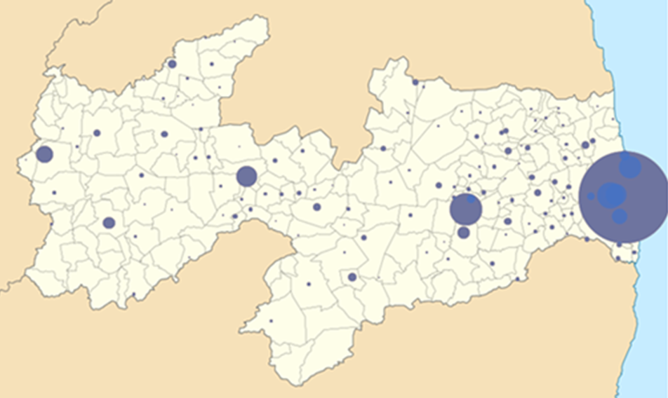 De acordo com a Figura 1, a maior concentração de ocorrências ambientais é, de fato, no município de João Pessoa; neste caso, observa-se uma bolha de maior raio mais ao leste do mapa (litoral do estado). Além disso, tem-se no Agreste, no município de Campina Grande, situado mais para o interior do estado, a segunda maior concentração desse tipo de ocorrência. Em tempo, é importante trazer que Campina Grande é o segundo maior município da Paraíba, o que pode ter refletido também sobre a concentração de ocorrências ambientais. Por sua vez, no Sertão, os municípios de Patos e Cajazeiras, representados pelas bolhas situadas no interior do estado (sentido Leste-Oeste), sinalizam uma maior concentração das ocorrências ambientais.