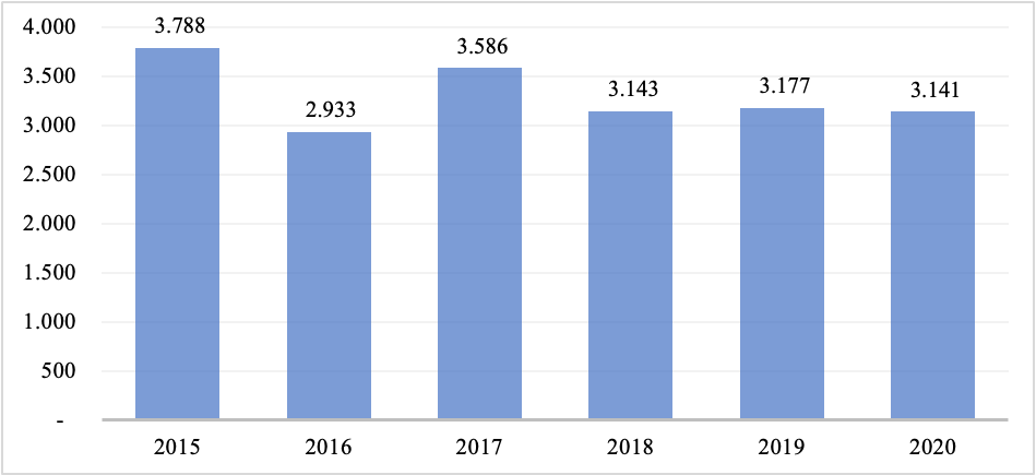 Ao analisar o número total de ocorrências atendidas pelo BPAmb, observa-se que não ocorrem variações significativas ao longo dos anos, sendo que nos últimos três anos os valores ficam em torno de 3.000 ocorrências (Gráfico 2). Dessa forma, é possível inferir que mesmo com a redução no atendimento de ocorrências comuns, como demonstrado no Gráfico 1, isso não interferiu no número total de ocorrências. Dessa forma, a redução na quantidade de ocorrências comuns foi compensada pelo aumento na quantidade de ocorrências ambientais. Logo, os resultados mostram que o efetivo da unidade esteve mais empenhado em ocorrências de sua especialidade (ambientais) nos últimos três anos, do que, comparativamente, em ocorrências não ambientais.