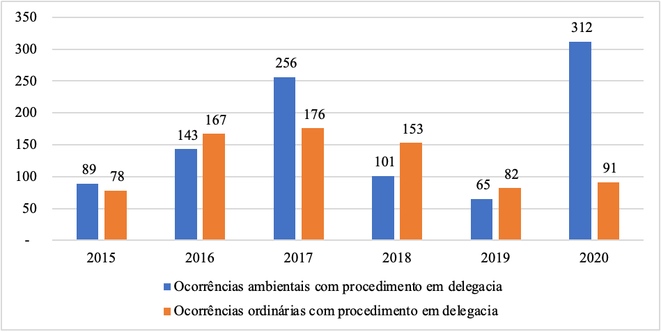 As ocorrências ambientais e ordinárias atendidas pelo BPAmb com procedimentos em delegacias oscilaram em torno de 70 a 320 casos no período. Ademais, os anos de 2017 e 2020 destacam-se em números de ocorrências ambientais com procedimentos em delegacias, com valores acima de 250 e 300 ocorrências, respectivamente. Para as ocorrências ordinárias, verificam-se os maiores números nos anos de 2016 a 2018 (Gráfico 3).